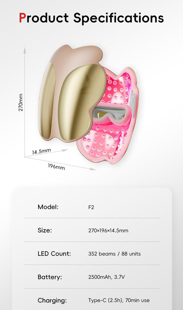 Even, comfortable coverage from 352 LEDs with red, blue, amber, and near-infrared (NIR) modes.